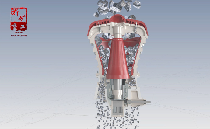 旋回破碎机是利用破碎锥在机架内锥腔中的旋回运动,对物料产生挤压、劈裂和弯曲作用,粗碎各种硬度的矿石或岩石的大型破碎机械。其主轴坐落在液压缸内的活塞上,改变活塞下的液压油体积就可以改变破碎锥的上下位置,从而改变排料口的大小。超载时,主轴向下的压力增大,迫使活塞下的液压油进入液压传动系统中的蓄能器,使破碎锥随之下降以增大排料口,排出随物料进入破碎腔的非破碎物(金属、木块等)。